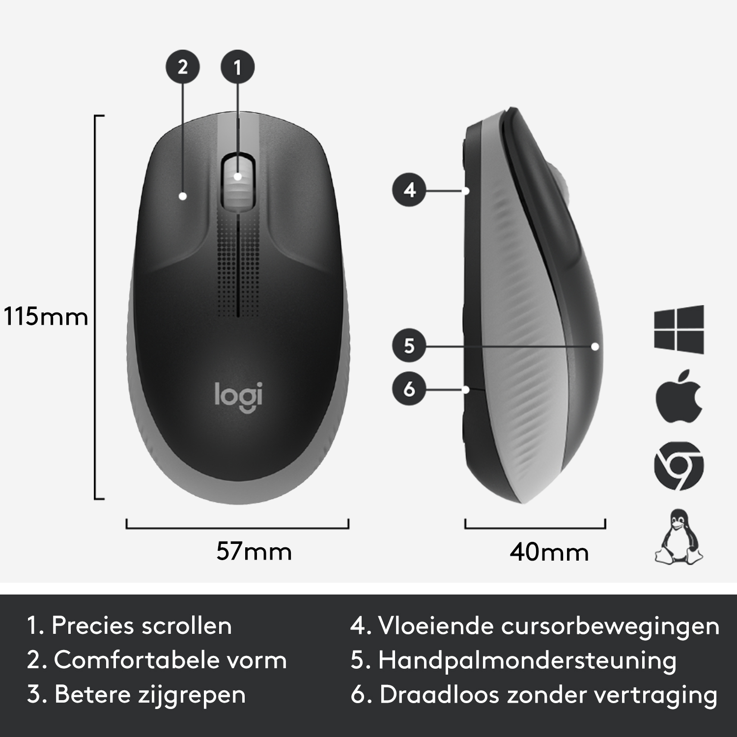COMFORTABEL ONTWERP VAN NORMAAL FORMAAT. DRAADLOOS ZONDER VERTRAGING.nLogitech M190 is een draadloze muis van normaal formaat met een comfortabel, gerond ontwerp dat de natuurlijke vorm van middelgrote tot grote handen volgt. nnWerk draadloos en beweeg je vrij rond binnen een bereik van 10 meter6Draadloos bereik en batterijlevensduur kunnen variëren, afhankelijk van omgevings- en computeromstandigheden., vrijwel zonder vertragingen of uitval. Je profiteert van uitstekende kwaliteit met een batterijlevensduur van 18 maanden7Draadloos bereik en batterijlevensduur kunnen variëren, afhankelijk van gebruiker, omgevings- en computeromstandigheden., precisietracking en accuraat regel voor regel scrollen tegen een betaalbare prijs.nnNORMAAL FORMAAT. OPTIMAAL COMFORTnOptimaal comfort voor beide handen met een geronde vorm die is ontworpen om de natuurlijke boog van grotere handen te volgen. De speciale concave toetsen leiden de vingers naar de ideale plaatsing, terwijl extra handpalmondersteuning de hele dag door comfortabel blijft.nnDUURZAME KWALITEITnProfiteer van de duurzaamheid en betrouwbaarheid van de wereldleider in muizen en toetsenborden8Gebaseerd op onafhankelijke verkoopgegevens van de belangrijkste markten in eenheden (december 2018 tot december 2019), alleen winkelkanaal: CA, CN, FR, DE, ID, KR, RU, SE, TW, TR, UK, US. Of je de M190 aansluit op je laptop of desktop of thuis of onderweg gebruikt, dit is een muis waar je op kunt vertrouwen. Pure kwaliteit met alles wat je nodig heeft tegen een betaalbare prijs.nnDRAADLOOS ZONDER VERTRAGINGnWerk draadloos en beweeg je vrij rond binnen een bereik van 10 meter, vrijwel zonder vertraging of uitval. Geen kabels betekent een opgeruimd bureau en gemakkelijk meenemen van de ene werkplek naar de andere.nnNAUWKEURIGE TRACKING. MOEITELOOS SCROLLEN.nNavigeer nog gemakkelijker dankzij het gecontroleerde regel voor regel scrollen. De optische sensor biedt vlotte en nauwkeurige cursorbesturing op bijna elk oppervlak.nnHierdoor krijg je nauwkeurige muisbewegingen zonder irritante gemiste klikken.nn18 MAANDEN. ÉÉN AA-BATTERIJ.nGeniet van een zorgeloze batterijlevensduur van 18 maanden9Batterijlevensduur kan variëren, afhankelijk van gebruiks- en computeromstandigheden. Energiebesparingsmodus wordt automatisch ingeschakeld wanneer je de muis niet gebruikt.nnPLUG-AND-PLAYnIs meteen klaar voor gebruik: gewoon aansluiten op een USB-poort en je kunt aan de slag.nnCOMPACT OF VAN NORMAAL FORMAATnKies het formaat dat het beste bij jou past. De M190 is speciaal ontworpen voor middelgrote tot grote handen en ideaal voor op je bureau. Bekijk de M185 voor een compacter, draagbaar ontwerp dat gemakkelijk mee te nemen is.