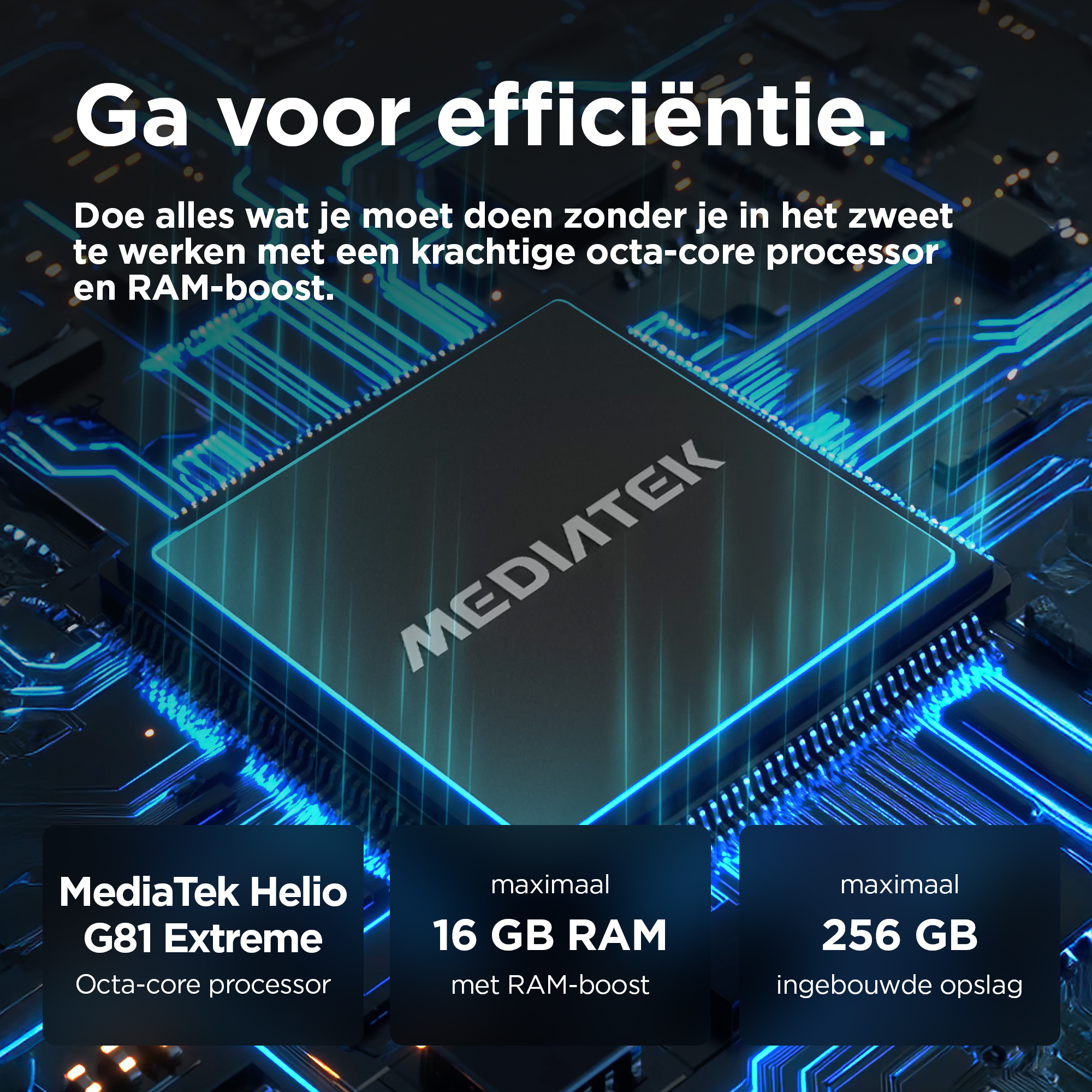 Scherpere foto’s. Schitterende verhalen.nErvaar adembenemend beeld en geluid met de nieuwe moto g05. Kijk je favoriete series en films op een superhelder display van 6,67 inch zelfs buiten in het zonlicht. En luister naar geluid overal om je heen dankzij krachtige stereoluidsprekers met Basversterking. Maak prachtig scherpe foto’s, dag en nacht, met het Quad Pixel-camerasysteem van 50 MP(2) met AI-powered portret. Verhoog je snelheid met superefficiënte prestaties en maximaal 12 GB RAM beschikbaar met RAM-boost(5). Met een afwerking van vegan leer, een waterafstotend design(4) en Corning® Gorilla® Glass 3 gaat de stijlvolle moto g05 lang mee. Vertrouw op een accu van 5200 mAh met een lange accuduur + TurboPower™ opladen. En krijg heel veel opslag voor je content en creaties. De moto g05 is in elk opzicht geweldig.