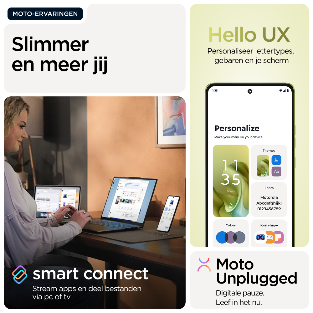 Opvallend design. Grote avonturen.nVoor wie grenzen wil verleggen in het leven: maak kennis met de moto g86 5G. Dit model is prachtig vormgegeven met hoogwaardige materialen en valt echt op door z’n opvallende design met geavanceerde water- en valbestendigheid(6,7). Zie alles op een ultra-helder 6,67-inch Super HD (1220p) display met Dolby Atmos®-geluid. Leg prachtige foto’s vans met de 50MP Sony LYTIA™ 600-camera met moto ai(12) en maak moeiteloos professionele foto’s. Profiteer van 41 uur batterijduur in slechts enkele minuten met TurboPower™ opladen(1,13). Ervaar de kracht van een geavanceerde processor en 8 GB – uitbreidbaar tot 24 GB met RAM-boost – en tot 256 GB aan opslag(3,9). Verhoog je creatieve vrijheid, soepele interactie en gemoedsrust met exclusieve Moto-functies. Geniet van het avontuur in het leven met de moto g86 5G.