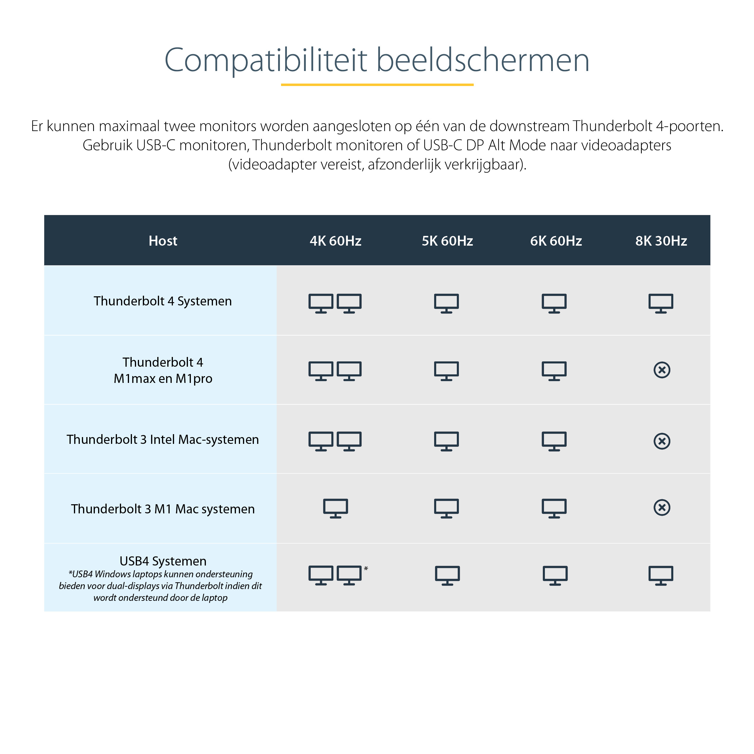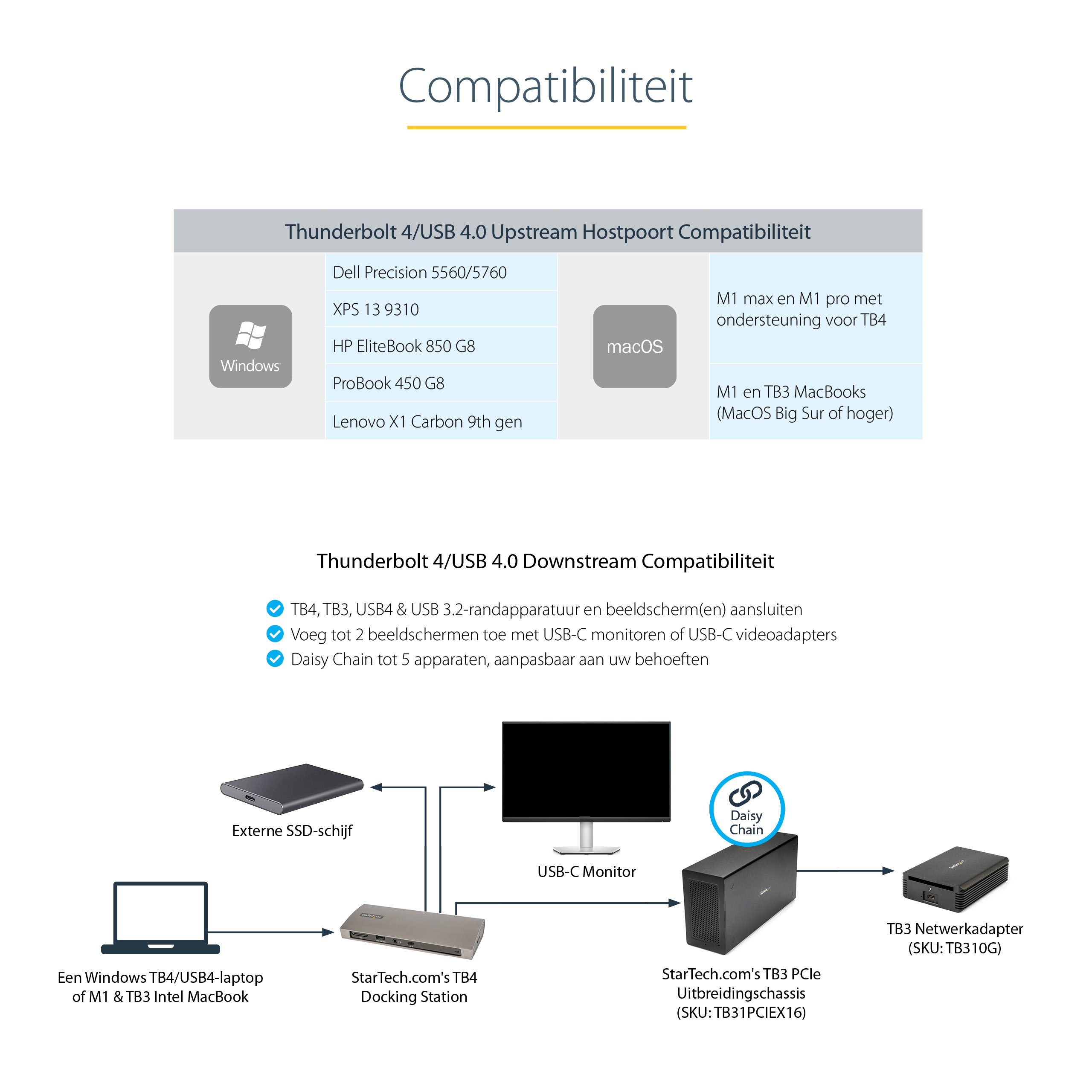 StarTech.com Thunderbolt 4 Dock, 96W Power Delivery, Single 8K/Dual Monitor 4K 60Hz, 3xTB4/USB4 ports, 4xUSB-A, SD, GbE, Thunderbolt 4 Docking Station voor Windows of TB3 MacBook, 0.8m Kabel. Connectiviteitstechnologie: Bedraad, Hostinterface: Thunderbolt 4, USB Power Delivery tot max.: 96 W. Ethernet LAN, data-overdrachtsnelheden: 10,100,1000 Mbit/s. Kleur van het product: Zwart, Grijs, Compatibele geheugenkaarten: MMC, MicroSD (TransFlash), MicroSDHC, MicroSDXC, SD, SDHC, SDXC, HD type: 8K Ultra HD. Compatibele soorten stopcontacten: EU. Ondersteunt Windows: Windows 10, Windows 10 Education, Windows 10 Education x64, Windows 10 Enterprise, Windows 10…, Ondersteunt Mac-besturingssysteem: Mac OS X 11.0 Big Sur, Mac OS X 13.0 Ventura