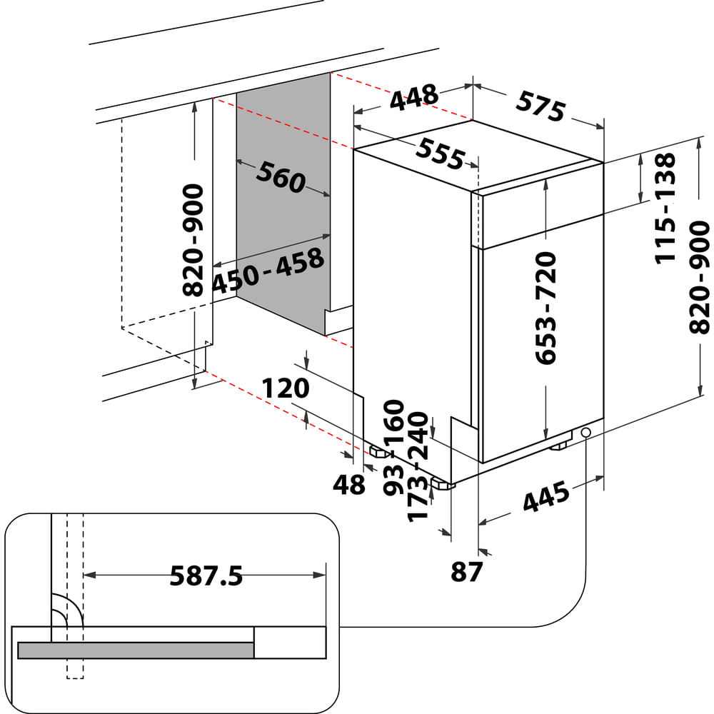 Whirlpool WSBC 3M27 X. Apparaatplaatsing: Onderbouw, Productafmeting: Slimline (45 cm), Kleur bedieningspaneel: Zwart, Roestvrijstaal. Aantal couverts: 10 couverts, Geluidsemissieklasse: C, Geluidsniveau: 47 dB. Energie-efficiëntieklasse: E, Waterconsumptie per cyclus: 9 l, Energieverbruik per 100 cycli: 76 kWu. Breedte: 448 mm, Diepte: 555 mm, Hoogte: 820 mm. Gewicht verpakking: 31,6 kg